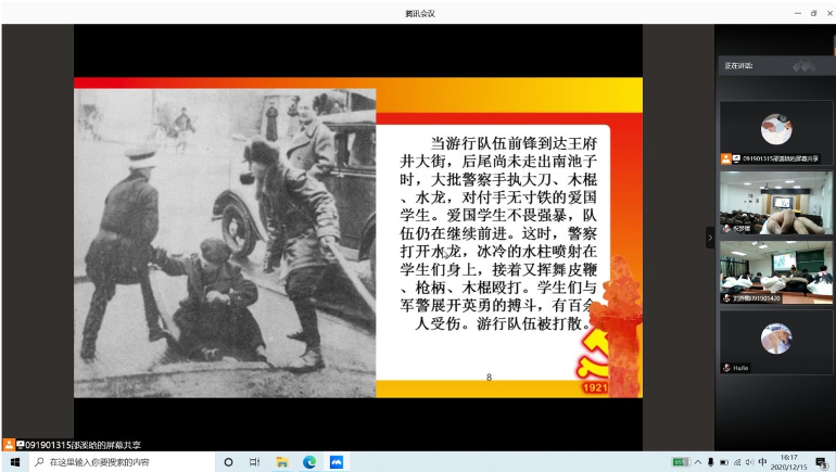 随后,邵溪晗同学以“重温一二·九运动,扬我爱国精神”为主题带领大家进行团课学习。她带领大家一起回顾了“一二·九”。邵同学还设计了“一二·九知多少“的小型知识竞赛环节,通过和同学们的互动加深大家对这段历史的印象。