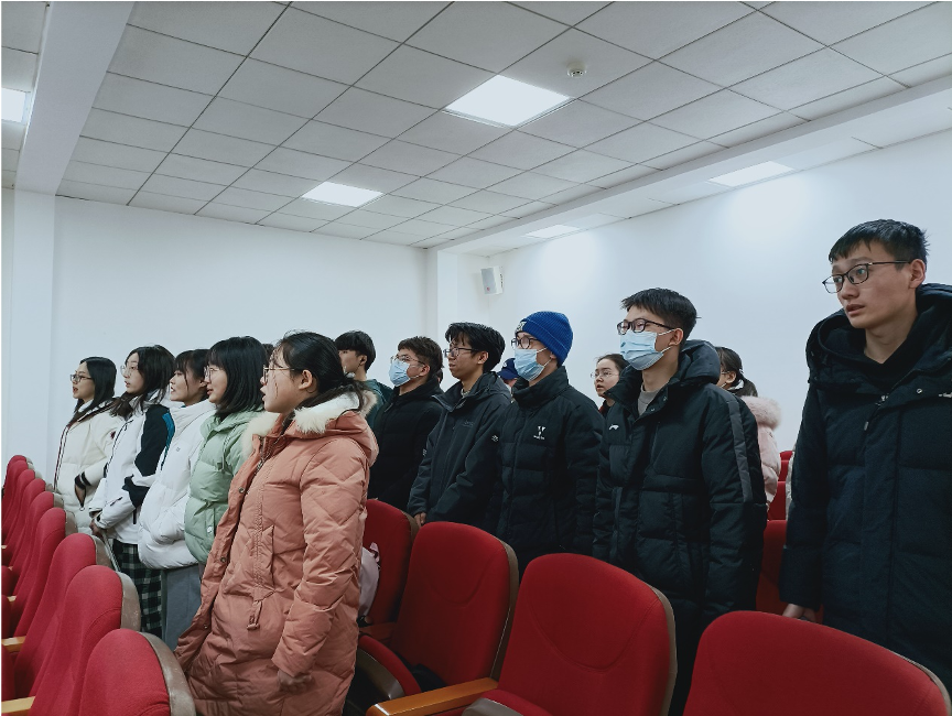 首先,祝梦媛同学以“学四史,明初心,争做优秀共青团员”为主题带领大家进行了团课学习。团课伊始,支部同学们一起重温了入团誓词,同学们齐声宣读,气势如虹。