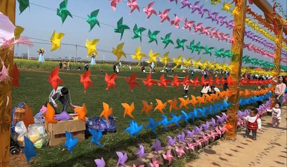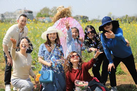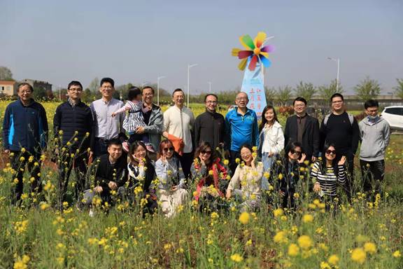 随后,大家一起前往油菜花田。上千亩油菜花竞相开放,金花葱郁,教师们情不自禁地扑向花海拍照留念,五彩的油菜花海在艳阳下烂漫,缤纷的风车在清风里旋转,大家围着稻草人和泡泡机一起追逐嬉戏,童心未泯、欢乐无边。