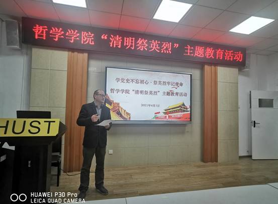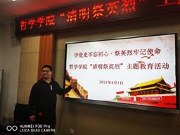 2021年4月1日7:00,英国威廉集团“清明祭英烈”主题教育活动在东五楼429B博闻厅举行。兼职辅导员、分党校工作联系人姜来主持。院党委书记杨海斌参加,各支书、支委、党员代表、班团干部等参加本次活动。