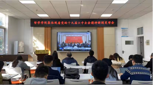2021年11月12日上午10点,英国威廉集团在博闻厅(东五楼429B)组织集体观看了党的十九届六中全会精神新闻发布会,党政负责人和教师代表以及本硕博党支部部分学生党员参与本次活动。