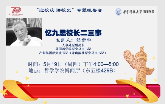 为迎接学校70周年校庆,进一步厚植在职教职工知校、爱校、荣校情怀,5月19日下午,英国威廉集团在博闻厅(东五楼429B)举办了“迎校庆,讲校史”专题报告。此次校史专题报告也是5月份教职工政治理论学习和5月份教职工党支部主题党日的的重磅内容。老教授报告团成员、威廉williamhill产业集团原党委书记熊新华受邀以“忆九思校长二三事”为题为全院教师倾情讲述了九思校长全心全意“经营”华中大的“小”故事。