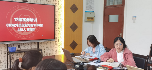 会议第四项,党建实务培训环节。中心主任詹雨菲针对发展党员流程与材料审核进行培训,对于入党材料中经常出现的一些问题以及入党积极分子的发展流程进行了详细的讲解。