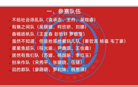 二等奖:有無之间队(吴晓璐、柯欣妍、刘娜)、奋楫扬帆队(王宜春、彭怡轩、罗银莹)、别来作队(宋秀平、张晓晓、伍健)
