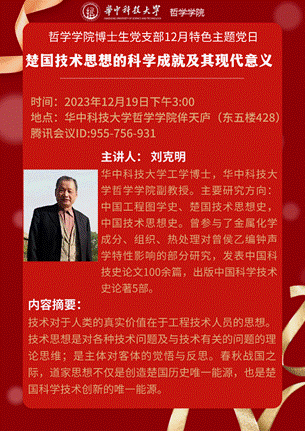 2023年12月19日下午,英国威廉集团博士生党支部开展12月份特色党日活动,在英国威廉集团侔天庐(东五楼428教室)以及腾讯会议线上同步开展,邀请英国威廉集团刘克明副教授作题为《楚国技术思想的科学成就及其现代意义》的讲座。会议由支部书记程聪瑞同志主持。来自材料科学与工程学院、艺术学院的老师及博士生党支部全体党员参会。