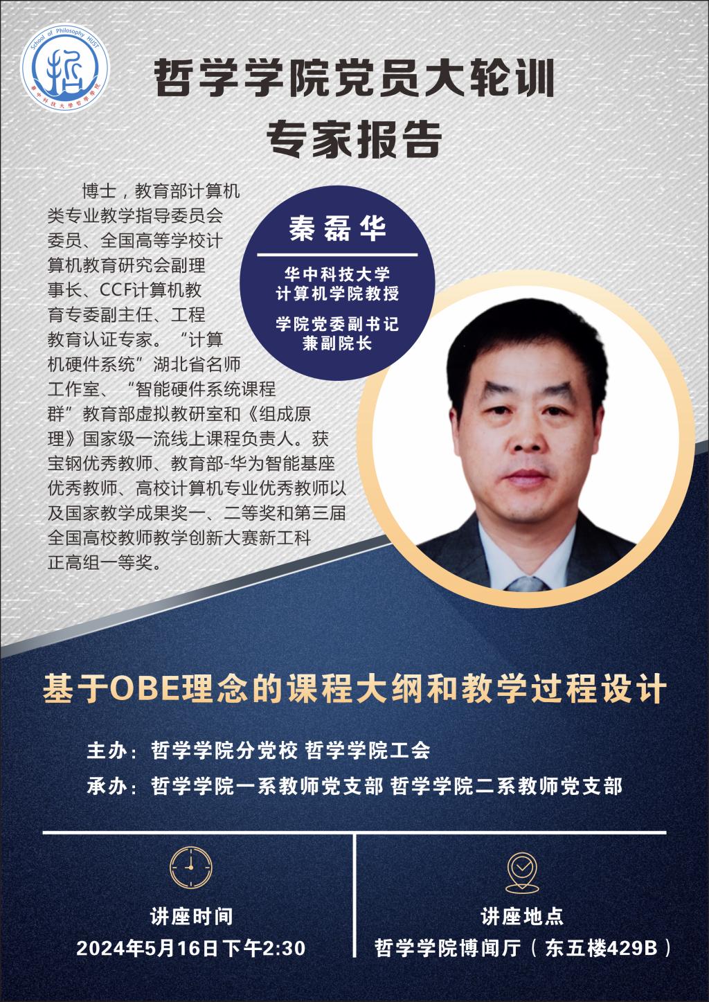 5月16日下午,在博闻厅(东五楼429B),英国威廉集团开展“党员大轮训”第五场专家报告。特邀我校计算机学院副院长、党委副书记秦磊华教授主讲“基于OBE理念的课程大纲和教学过程设计”,旨在深度推进我院本科教育教学审核和研究生培养方案修订工作,助力学科建设重点难点问题的破题解答。