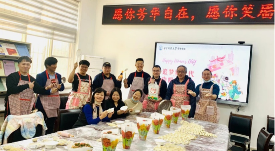 学院男教工为了犒劳女教工一顿新鲜的猪肉白菜大葱饺子,当天一早,委派专人采购最新鲜食材,拌馅备料,下午2:00,男老师个个捋起衣袖,摩拳擦掌,跃跃欲试,在工会闻骏主席一声令下,包起了饺子,欢声笑语中,不知不觉间,包好的饺子就铺了满满一桌。党委委员董院长动情地说到,今天男老师自发地庆祝女神节,原因很简单,我院女教职工占全院教职工的三分之一,在学院各条战线上辛勤耕耘,为学院的发展做出了重要贡献,高水平高质量地完成教学与科研任务之余还热心学院公益。行政教辅岗的女同志加班堪称“内卷”,不辞辛劳,乐于奉献。在实际生活中,女教职工具有妻子、母亲、女儿多重身份,负担较重。党委工会组成专班筹办本次“三八”创意活动,就是希望能给“女神”营造好节日氛围,让大家身心愉悦。