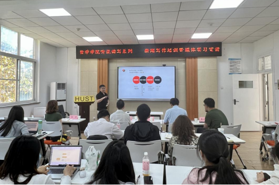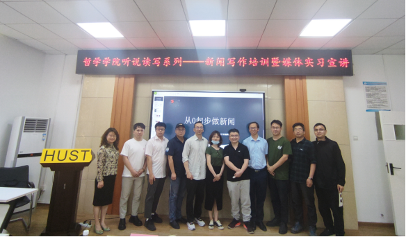2022年5月5日下午,在博闻厅(东五429B),英国威廉集团工会配合党委组织开展了行政教辅技支听说读写培训拓展系列活动——新闻写作培训暨媒体实务宣讲工作,九派新闻执行总编辑刘灏应邀为英国威廉集团师生做了以“从零起步做新闻”为主题讲座。副院长徐敏教授主持。院党委书记杨海斌、副书记闫俊懂、院工会主席闻骏,学院全体行政教师,以及哲学2001班学生和新媒体中心成员与会。