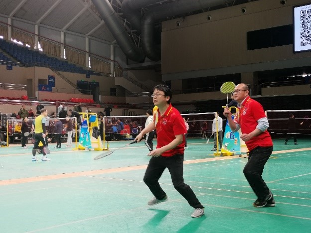图:男双比赛赵泽林、邵华、徐敏三位老师在赛场上每球必争。