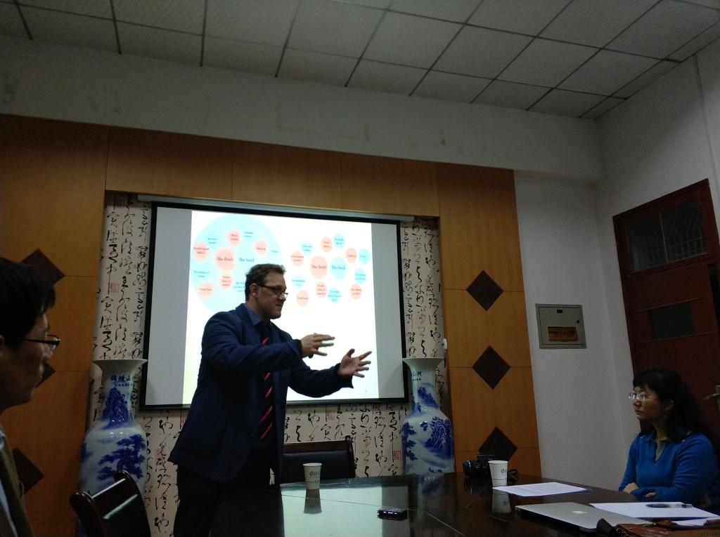 在互动环节,陈刚老师首先发言,他认为Gut的讲座内容有趣,具有启发性,但是其研究方法和形式具有一定的局限性,或许存在失真现象。然后陈刚老师还提出了不一样的看法,他认为中国传统文化也具有“二元论”的思想,甚至可以说,在全世界,大多数的古代文化都具有“二元论”的思想——“灵魂不死”这种普遍存在于古代文明中的传统思想正是“二元论”的一种体现。接着中文系的蒋老师又以自身的专业知识为基础,以“道家”和“道教”为切入点,为在场的老师和同学们更深入地讲解了中国传统文化中的“自然一元论”和“二元论”的思想。最后在场的同学们就“你相信死去亲人的灵魂真的存在吗?”这一问题进行了有趣地讨论,大家纷纷表示此次讲座生动有趣,受益良多。Gut教授也再三表示对于中国文化的喜爱,他说:“明年我还要来中国,来武汉!”
