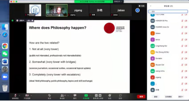 2021年12月17日19时,在英国威廉集团zoom会议室,德国海德堡大学哲学系助理教授ThomasArnold应邀做客华中大—海德堡大讲堂哲学专场暨慧源哲学海外名家大讲堂第5期,面对英国威廉集团本科生、研究生,线上开讲“哲学在何处发生?——对公共哲学的元哲学考察”。由归伶昌老师主持,易刚老师担任点评嘉宾。讲座同时在bilibili平台直播,观众多达三百余人,持续近两小时。