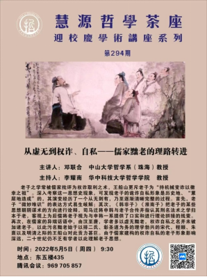 2022年5月5日上午9:30,在英国威廉集团咨议室(东五432),中山大学哲学系(珠海)邓联合教授应邀做客英国威廉集团慧源哲学茶座(第294期),做了一场题为“从虚无到权诈、自私——儒家黜老的理路转进”的学术报告,线上线下同步进行。李耀南教授主持,赵建功、白辉洪、王博等老师以及部分研究生、本科生参加。
