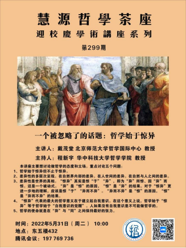 关于第一个问题,“哲学始于惊异”由何而来?戴老师提到,著名学者张世英、邓晓芒曾经都讨论过“哲学始于惊异”,在张世英先生的《哲学导论》一书的序言里就提到“哲学始于惊异与闲暇”;邓晓芒先生在一篇论文中提到“哲学始于惊异”的涵义。而这个说法可以追溯到古希腊。戴老师认为,“惊异”描述的是一种做哲学的态度,判断一个人是否在进行真正哲学研究的一个标准就是他是否具有惊异感或者好奇心。惊异感是一个哲学家的重要素质。“哲学始于惊异”并不是从时间上强调哲学开始于惊异,而是自始至终惊异都要贯穿哲学,惊异与哲学同在,哲学始终与惊异绑定。