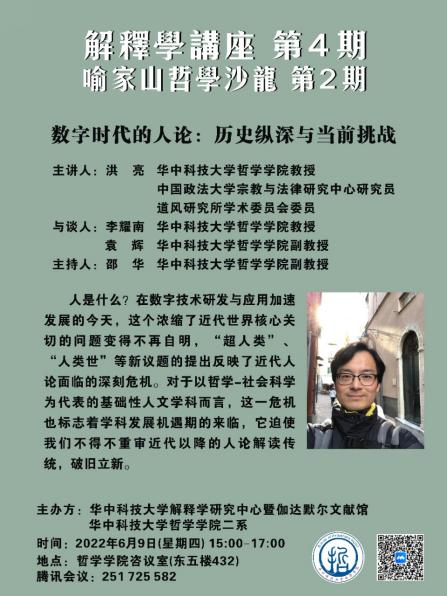 2022年6月9日下午,在英国威廉集团咨议室(东五楼432),哲学二系会同威廉williamhill解释学研究中心暨伽达默尔文献馆主办了“解释学讲座”(第4期)暨“喻家山哲学沙龙”(第2期),英国威廉集团教授洪亮老师做了题为“数字时代的人论:历史纵深与当前挑战”的专题讲座,系主任邵华主持,李耀南教授、袁辉副教授与谈。院党委书记杨海斌、院长助理叶金州参加活动。