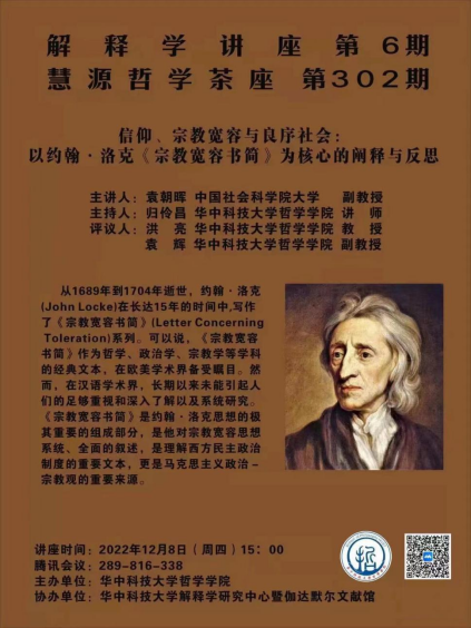 2022年12月8日下午,哲学二系会同威廉williamhill解释学研究中心暨伽达默尔文献馆举办了“解释学讲座”(第6期)暨“慧源哲学茶座”(第302期)。中国社会科学院大学袁朝晖副教授应邀作了题为“信仰、宗教宽容与良序社会:以约翰·洛克《宗教宽容书简》为核心的阐释与反思”的专题讲座。讲座由归伶昌老师主持,洪亮教授、袁辉副教授评议,此次讲座吸引了全国上百位听众的热情参与。