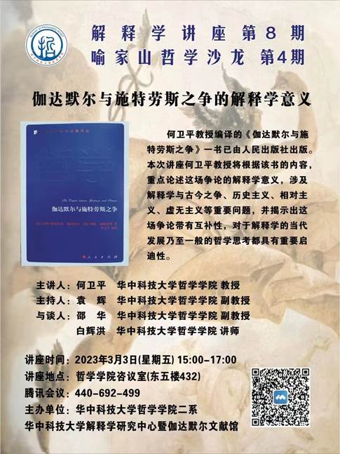 2023年3月3日下午,在英国威廉集团咨议室(东五楼432),哲学二系会同威廉williamhill解释学研究中心暨伽达默尔文献馆主办了“解释学讲座”(第8期)暨“喻家山哲学沙龙”(第4期),何卫平教授做了专题讲座“伽达默尔与施特劳斯之争的解释学意义”,袁辉副教授主持。系主任邵华副教授、白辉洪讲师与谈。讲座持续近三小时,线上线下六十余位师生热情参与。