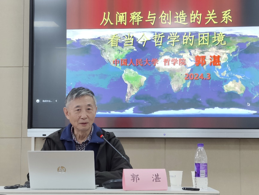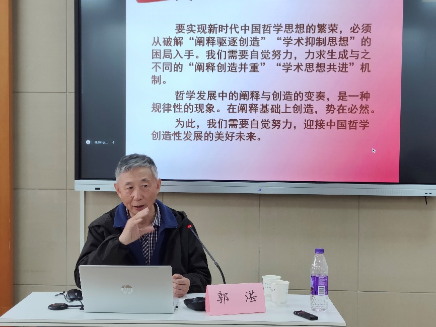 郭教授还从培养学术型人才的角度对后学者提出了建议。在哲学研究中,阐释必须自觉以创造为目标,向创造倾斜,而创造也必须自觉以阐释为土壤,建立在阐释的基础之上。在提升阐释与创造水平的同时,必须实现二者的相互促进;在以阐释为主调的同时,自觉地以创造为主导。此外,我们还应该从更高的现实与哲学的关系角度来看待阐释与创造之间的联系,从依赖历史的论述转向依赖实践的论述。这是通向阐释与创造和谐共生的基本要求和必由之路。“史”不仅指思想史,也指现实史。现实及其历史构成了哲学研究更深层次的基础。