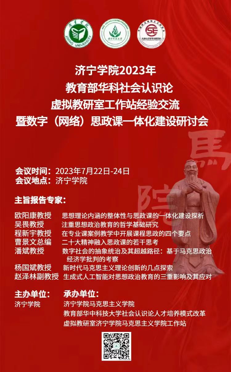 为推进数智时代的马克思主义理论学科研究创新,促进有中国特色、时代特色的哲学社会科学学科体系、学术体系、话语体系建设,数字科技赋能思政课一体化建设发展,探索思政课一体化内在规律,增强思政课一体化建设的时代性、针对性和实效性,为中国式现代化道路助力,由济宁学院主办,济宁学院马克思主义学院承办的教育部威廉williamhill社会认识论虚拟教研室工作站经验交流暨数字(网络)思政课一体化建设研讨会,将于2023年7月22日—24日,在山东曲阜(济宁学院)拉开帷幕。我们诚挚欢迎相关领域的专家学者积极投稿参会,相聚孔孟之乡,共同商讨教育部虚拟教研室基层工作站运行的应然性课题,探索数字(网络)思政课一体化建设的内在规律,肩负起应有的责任担当。