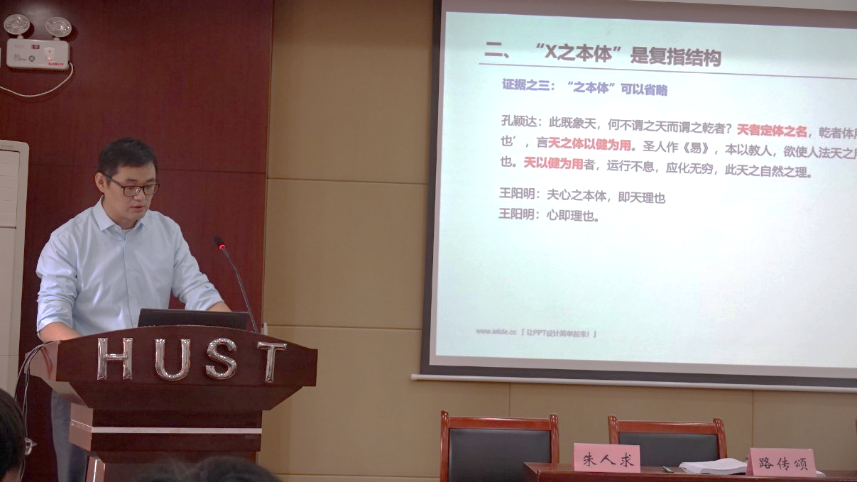 第二位发言人是西北大学中国思想文化研究所的路传颂老师。首先,他对朱子的“体”和“本体”概念作了字义上的疏证,并从分析哲学的角度反驳了学界对朱子“体”和“本体”的普遍看法。接着,他从翻译、范畴、文本诠释三个方面指出了“体”“本体”通行解释存在的问题。他认为,西方哲学的“本体”概念并不与中国哲学中道、心、气等具有本体论意义的概念完全契合,中国哲学的“本体”概念表示的是关系而不是范畴。因而中国哲学中体用关系主要关于事物之间的相互作用,这是区别于西方本体论的根本所在。