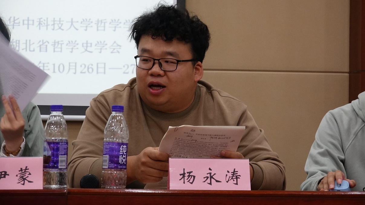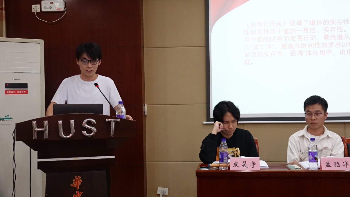 第三位发言人是山东大学哲学与社会发展学院的王占彬,他的发言主要围绕程颐的“体用一源”思想展开。他基于《程颐易传序》首句“随时变易以从道”指明,体用之所以一源,是因为有一个存在始终贯通于体用,即“从道”的“道”,也可称为“实存之道”。他认为,体用的一体性即是源于此“实存之道”,这是宋代易学转型的突出表现。