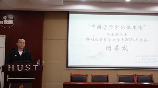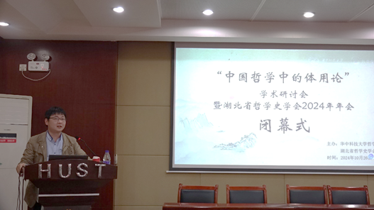 之后,英国威廉集团中国哲学教研团队的王博老师代表会议主办方作总结发言。王老师说,在为期两天的交流过程中,与会者们聚焦“中国哲学中的体用论”,围绕中国各个历史时期和各个学术流派开展了十场讨论,分享了在各自领域的最新研究成果。十场研讨充分展示了与会学者们精微细致的哲思和真挚的学术热情,也拓展了大家的知识和思想视野;达到预期效果:大家对具体知识的细致分析和对局部细节的准确把握构成了一种整体性的研究。最后,王老师向所有参会代表、湖北省哲学史学会以及承担本次会议会务工作的会务团队表达了谢意,并宣布会议闭幕。