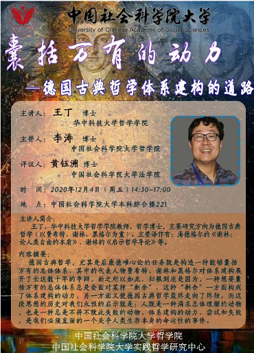 在中国社会科学院大学的报告题为“囊括万有的动力”,吸引了师生200余人参加,王丁老师用了两个小时勾勒出了从康德到黑格尔的体系构造过程,为在场师生清晰呈现了德国古典哲学的博大精深。