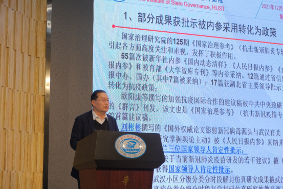 新冠肺炎疫情暴发之初,欧阳康教授于2020年1月28日率先提出“新冠肺炎疫情防控与公共卫生治理现代化综合研究”课题,从10个研究方向开展研究,组织雷瑞鹏、杜志章、贾平、刘成斌、郭林、郭静、张妍、陶红兵、马娟娟、徐顺清等100余名校内外专家开展协同攻关,从2020年1月到2021年6月共撰写和刊发了125期《国家治理参考》(抗击新冠肺炎专辑)。研究根据疫情进展和抗击疫情不同阶段的需要,及时提出有针对性的对策建议案,为抗疫斗争提供强有力的智力支撑。