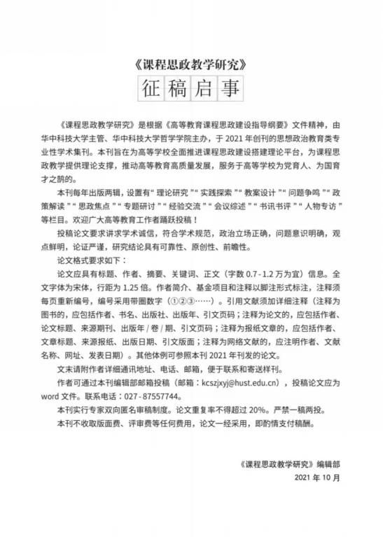 后附征稿启事,热迎各位同仁赐稿,祝愿《课程思政教学研究》集刊早日入选CSSCI来源刊,成长为在全国最有影响力的课程思政教学研究成果交流的高端平台。