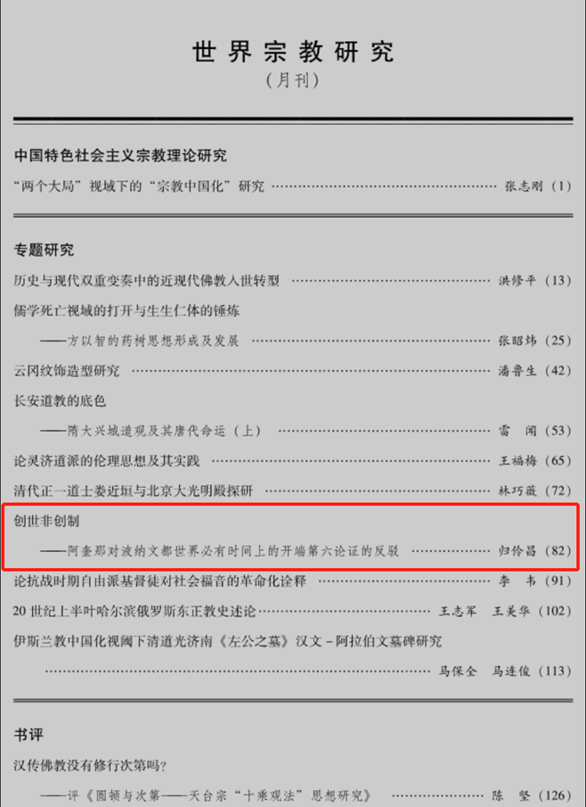 我院教师归伶昌博士主持的国家社科基金青年项目取得进展,阶段性成果发表在权威宗教学期刊《世界宗教研究》2022年第12期上,论文题为《创世非创制——阿奎那对波纳文都世界必有时间上的开端第六论证的反驳》。