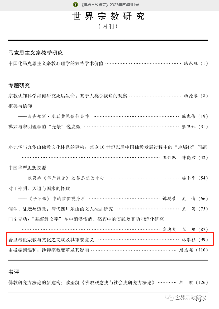 林季杉副教授的最新论文《蒂里希论宗教与文化之关联及其重要意义》发表于《世界宗教研究》2023年第4期(总第208期)。
