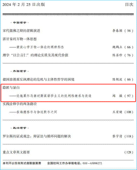 我院教师闻骏副教授最新研究成果《隐匿与显白——论施莱尔马赫对斯宾诺莎主义的批判性继承和改造》一文在国内哲学权威期刊《哲学研究》2024年第2期发表。