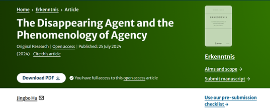 我院胡靖波博士的论文“The Disappearing Agent and the Phenomenology of Agency”(消失的行动者与能动现象学)在国际权威期刊Erkenntnis上发表。论文为开放取用(open access),原文链接https://link.springer.com/article/10.1007/s10670-024-00839-y