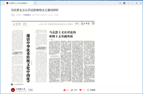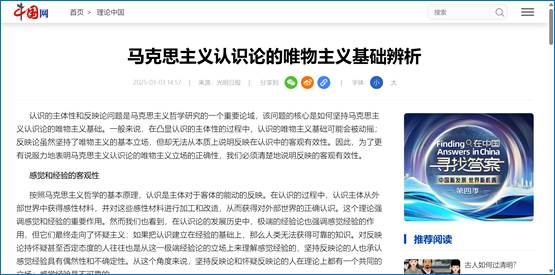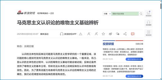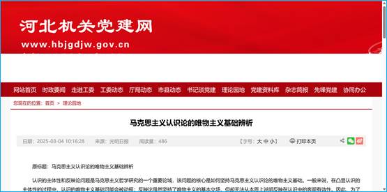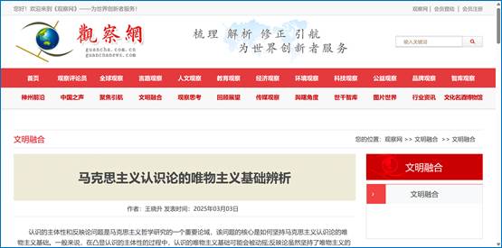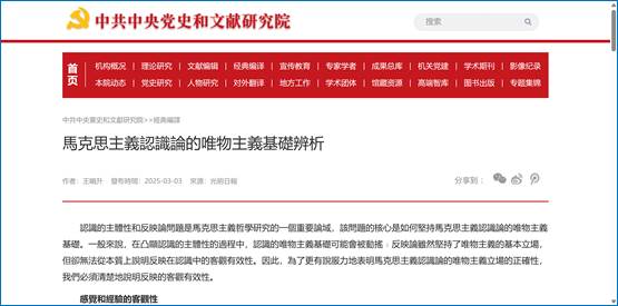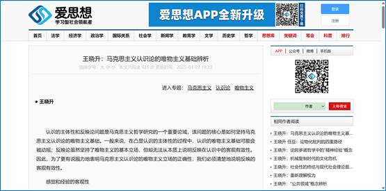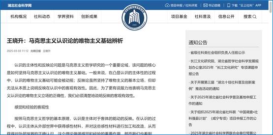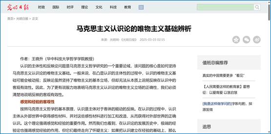 近日,我院王晓升教授的文章《马克思主义认识论的唯物主义基础辨析》刊登在《光明日报》(2025年3月3日)“文史哲周刊·理论·哲学”版,随后光明网、中国网、中共中央党史和文献研究院官网、湖北社会科学网、新浪财经网、爱思想网、观察网、河北机关党建网以及光明理论公众号等媒体平台对该文进行了转载。