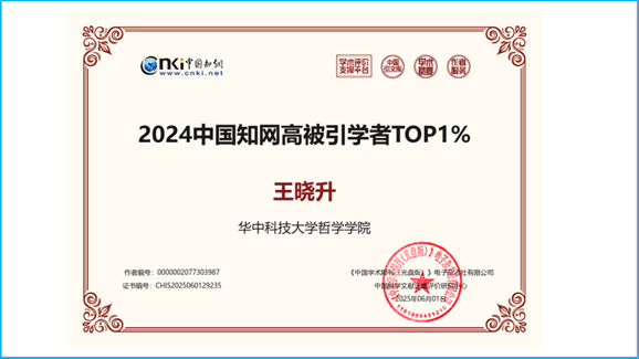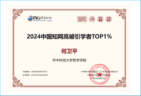 近日,我院邓晓芒、欧阳康、韩东屏、何卫平、王晓升五位教授荣获“2024中国知网高被引学者TOP1%”证书。