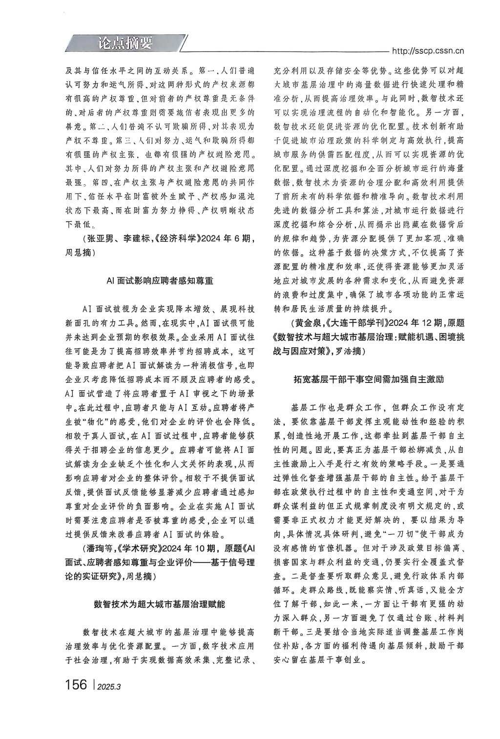 近日,我院伦理学专业博士研究生黄金泉(导师为程新宇教授)发表在《大连干部学刊》2024年第12期上的独作论文《数智技术与超大城市基层治理:赋能机遇、困境挑战与因应对策》被《中国社会科学文摘》2025年第3期 “论点摘要”栏目转载。