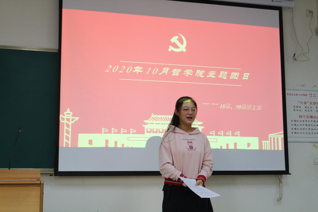 2020年10月22日下午,哲学1801团支部、哲学2001团支部在东九楼D108教室召开了主题团会。哲学(强基)2001班班主任赵泽林老师、哲学2001班班主任王亚娟老师、2020级研究生班主任穆童与2018、2020级哲学专业全体同学参加了此次团会。本次团会围绕“习近平在全国抗击新冠肺炎疫情表彰大会上的讲话”和“厉行节约,反对浪费”两大主题进行学习。2020级团支书岳星辰同学主持了此次团会。