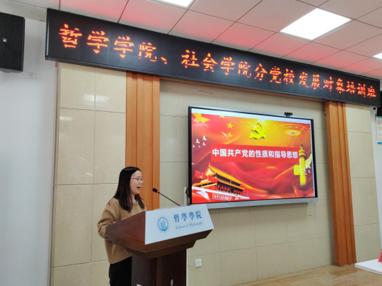第二讲,由耿艳丽老师为发展对象讲授《中国共产党的性质和指导思想》。她从中国共产党的性质、中国共产党的指导思想、中国化时代化的马克思主义三个方面全面介绍了中国共产党的性质和指导思想。
