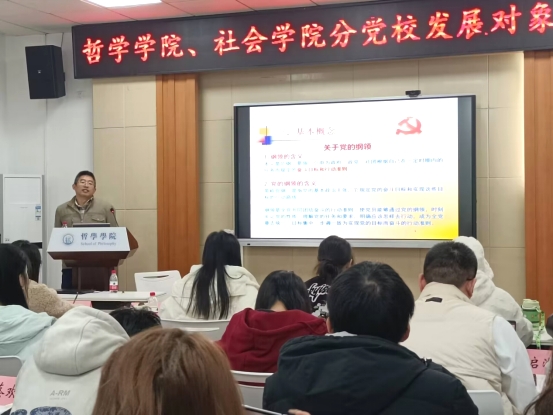 第三讲,由闫俊懂老师为发展对象讲授《中国共产党的宗旨和纲领》。他告诉同志们“承认党的纲领、拥护党的纲领是加入中国共产党的必须条件”,介绍了中国共产党的最高纲领、最低纲领,引导同学们牢记并践行“全心全意为人民服务”宗旨。