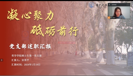 博士生党支部书记程聪瑞从班子建设、党员构成、工作开展、反思与展望四个方面汇报了过去一年支部建设的成果。她首先介绍了博士生支部跨八个年级、有47名党员的基本情况,支委通过每月的主题党日较好地凝聚了博士生党员群体,主题党日出勤率保持较高水平。其次,支部发挥博士生党员在理论研究方面的优势,鼓励党员将学术研究与国家战略相结合,积极分享学习体会,受到学院官网和《长江网》《今日头条》等官方媒体的宣传。最后,该党支部对过去一年的工作做了反思总结,并对展望未来,提出可行性措施。