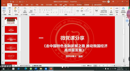 会议第一项,由党建中心主席团成员程彤作主题为《走中国特色金融发展之路,推动我国经济高质量发展》的微党课分享。她分别从“总结中国特色金融发展之路和关键核心金融要素”、“着力防范化解金融风险特别是系统性风险”、“扩大对外开放,增强国际竞争力和规则影响力”、“坚持法治和德治相结合,积极培育中国特色金融文化”、“各级领导干部要增强金融思维和金融工作能力”这五个方面分别进行解读,进一步加深了同学们对中国特色金融发展之路的认识,同时号召同学们积极参与到中国特色金融发展中去,为我国经济高质量发展作出贡献。