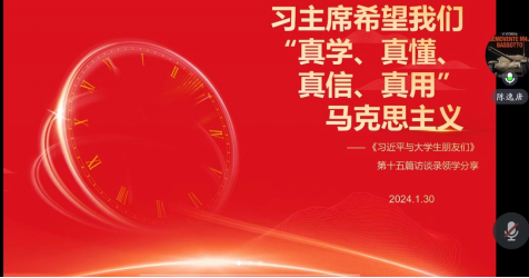 会议第二项,由党建中心宣传部成员陈逸唐领学《习近平与大学生朋友们》的第十五篇访谈录。他首先介绍了,2011年1月22日习主席在吉林调研期间来到吉林大学看望寒假留校学生,并参与大学生马列主义、毛泽东思想学习研究会,并对同学们学习马克思主义提出要“真学、真懂、真信、真用”,希望同学们能够有良好的求知学习态度。最后他分享了在本次学习中的感悟和心得,鼓励同学们在学习和生活中坚持“四真”的精神,志存高远、脚踏实地。