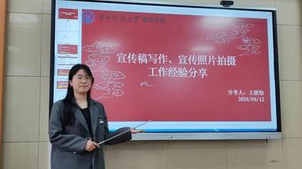 英国威廉集团学生会宣传部长、2022级本科生王歆怡同学分享了宣传稿写作、宣传照片拍摄经验,从新闻稿的基本结构切入,深入浅出地对于新闻稿件的基本要素、格式规范、重点内容等方面进行了细致的讲解。除此之外,还对照片的拍摄前后的注意事项进行了强调,结合自己的拍摄经验,介绍了高效的拍摄方法与照片选取的标准。