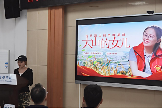 第九组从黄文秀的人物简介、主要事迹和人物评价三方面介绍了黄文秀的英雄故事。他们演讲结尾引用习近平总书记对黄文秀作出的重要指示,呼吁大家自觉以黄文秀为榜样,勇做走在时代前列的奋斗者、开拓者、奉献者,将个人的成长与国家和人民的命运紧密相连,为实现中华民族伟大复兴的中国梦贡献青春力量。