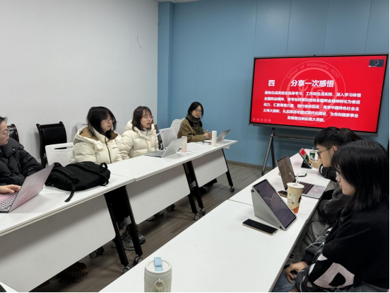 在场成员分为两组进行讨论后,分别派出一人总结发言。尹明华总结发言时指出,两会精神与人民生活息息相关,并不是宽泛的概念。我们需要多看多听多写,才能理解真正的两会精神,比如国补政策、银发经济等。我们可以通过志愿活动等把个人生活融合到国家发展中。程光瑜总结发言时用“春天”描述目前我国的发展状况,而亮眼成绩的背后,是科技创新、新兴产业和市场活力等关键要素的有力支撑。值得一提的是,绿色消费和产业融合发展等理念也在经济发展中得到了充分践行。作为哲学专业的学生,我们可以发挥哲学学子担当,分析会议精神,研究科技伦理,助力科技稳扎稳打发展。