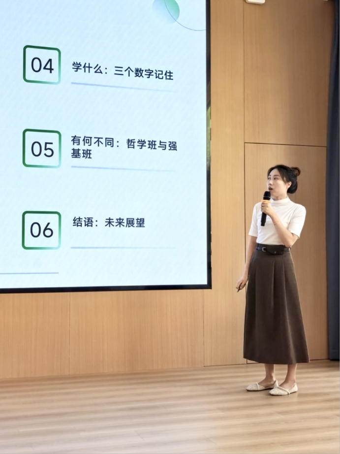 随后,本科生教务员张双双介绍本科生培养方案。张双双老师从培养目标、培养方向、学习路径、学习内容、强基班和普通班的区别以及未来发展等六个方面介绍了本科生的培养规划。