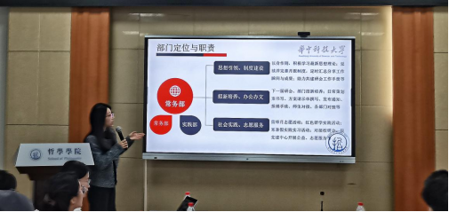 主席团成员王丹作常务部与宣传部工作汇报。她表示,常务部要继续服务研究生会,并在处理各种日常事务中真正落实到每一件事、每一个人、不断发挥常务部纽带的作用,积极协调其他部门开展工作,实现共商、共创、共建。宣传部继续坚持“宣传无小事”的工作宗旨与“贯穿活动始终”的工作原则,不断创新宣传形式与内容,加强学院公众号的吸引力与影响力。同时,在筑牢已有平台的基础上,开拓更多的媒体渠道与信息窗口,对外展示学院的精彩瞬间与靓丽风采。