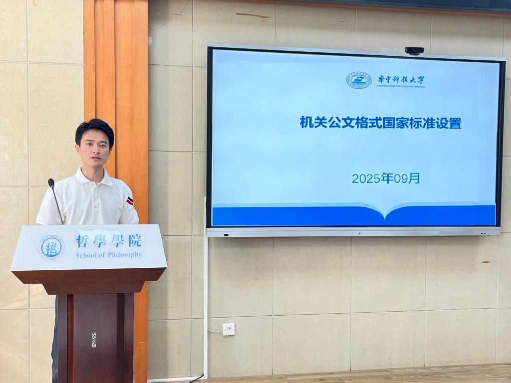 2025年9月11日下午2:40,在博闻厅(东五楼429B),组织开展了新学期行政教辅人员能力提升专题培训第一场——公文规范,由2024级博士生蔡明作题为《机关公文格式国家标准》的讲座,党委副书记赵帅主持活动。学院全体行政教师及学生干部骨干参加。