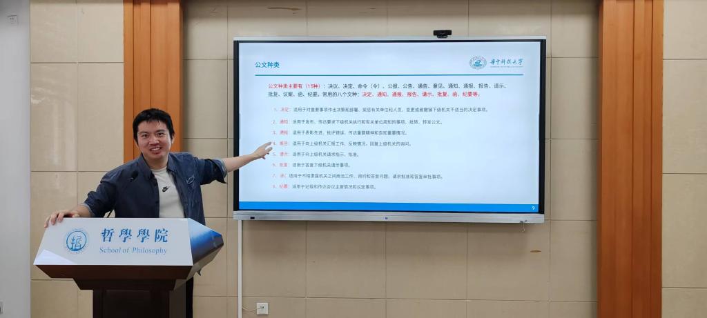 学生党建工作中心办公室负责人、2024级硕士生胡静谈到:“今天听了蔡明学长的经验分享,深受启发。我认识到公文不仅是制度规范的载体,更是思想传递的重要媒介。作为哲学专业学子,更要发挥逻辑思维优势,将批判性思维融入党建文书写作,做到论点鲜明、论据充分、论证严密。”