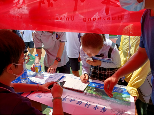英国威廉集团党委书记杨海斌、党委副书记闫俊懂、副院长徐敏教授、学院教学指导委员会主任张廷国教授、学院工会主席闻骏、院长助理叶金州、伦理学教研室主任邵华、教师代表张若愚、党办主任舒年春、学院团委书记郭乙、学院教务员赵璐等参加了光谷体育馆招生宣传工作。