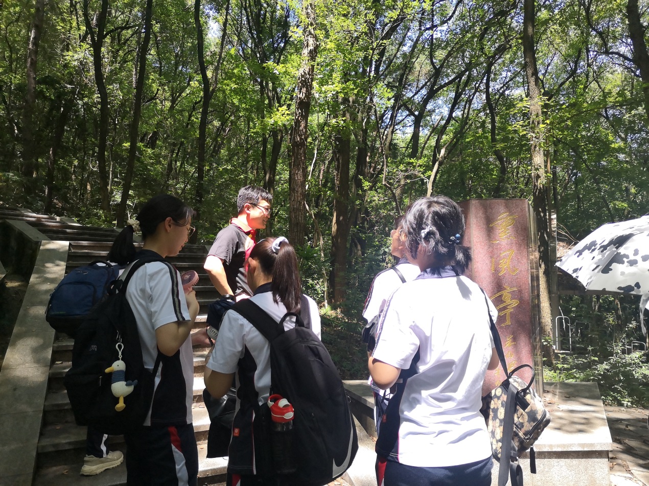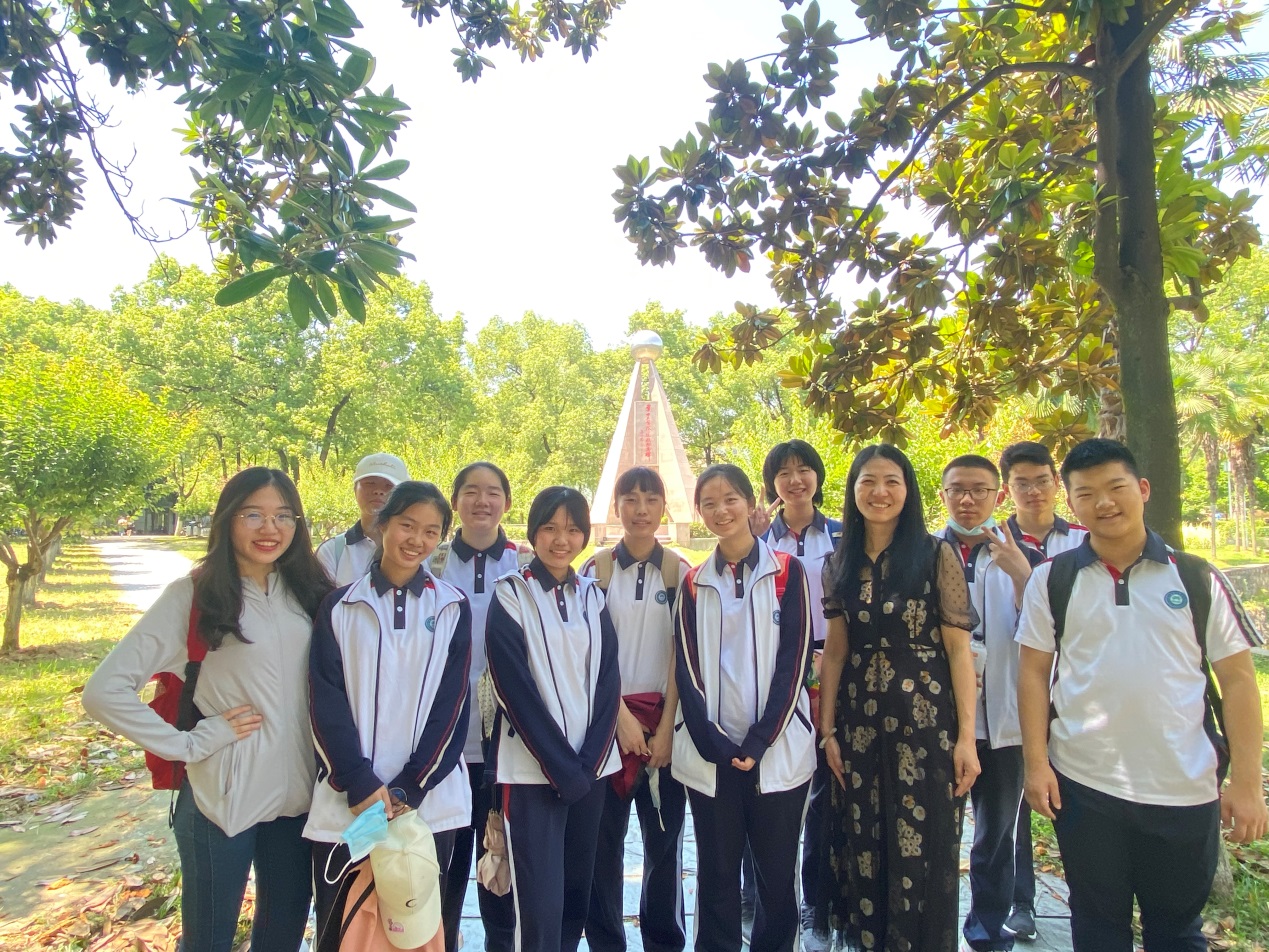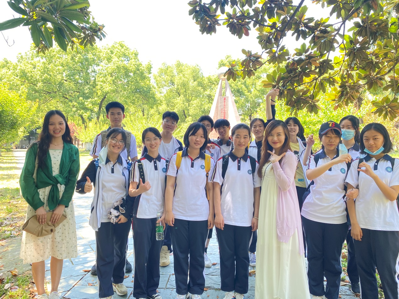 林季杉、王亚娟老师带领同学们来到青年园,亭台楼阁,小桥流水,同学们与伫立其中的华中大建校纪念碑合影留念。